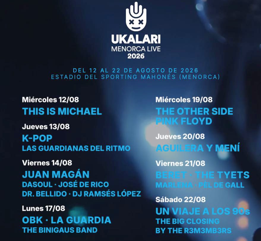 On en sait un peu plus sur le programme musical et culturel de 2026. Un nouveau rendez-vous arrive : Ukalari Menorca Live se déroulera du 12 au 22 août à Mahón. Le festival réunira de jeunes artistes espagnols comme Juan Magán, Beret, The Tyets, OBK, La Guardia et Marlena, ainsi que des tribute (groupes hommage) :